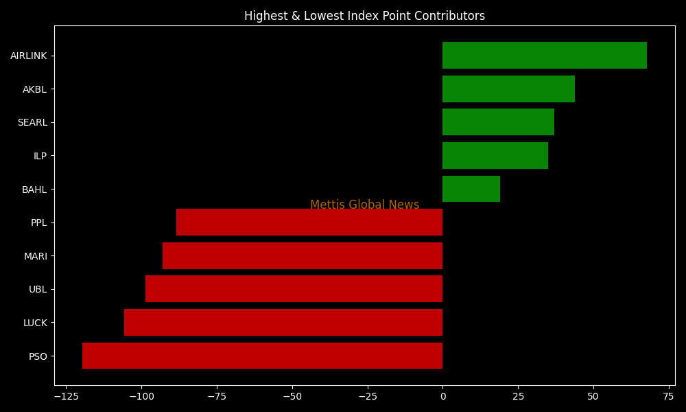 In terms of index-point contributions, companies that dragged the index lower were PSO (-119.60pts), LUCK (-105.73pts), UBL (-98.62pts), MARI (-92.90pts), and PPL (-88.42pts).