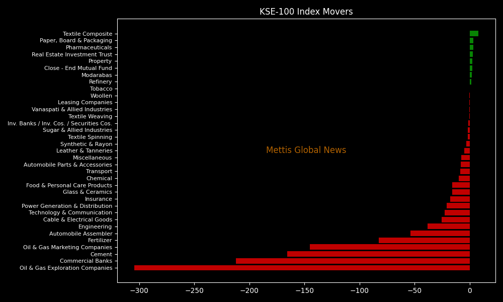 Sector-wise, KSE-100 Index was let down by Oil & Gas Exploration Companies (-304.32pts), Commercial Banks (-212.22pts), Cement (-165.55pts), Oil & Gas Marketing Companies (-144.89pts), and Fertilizer (-82.55pts).