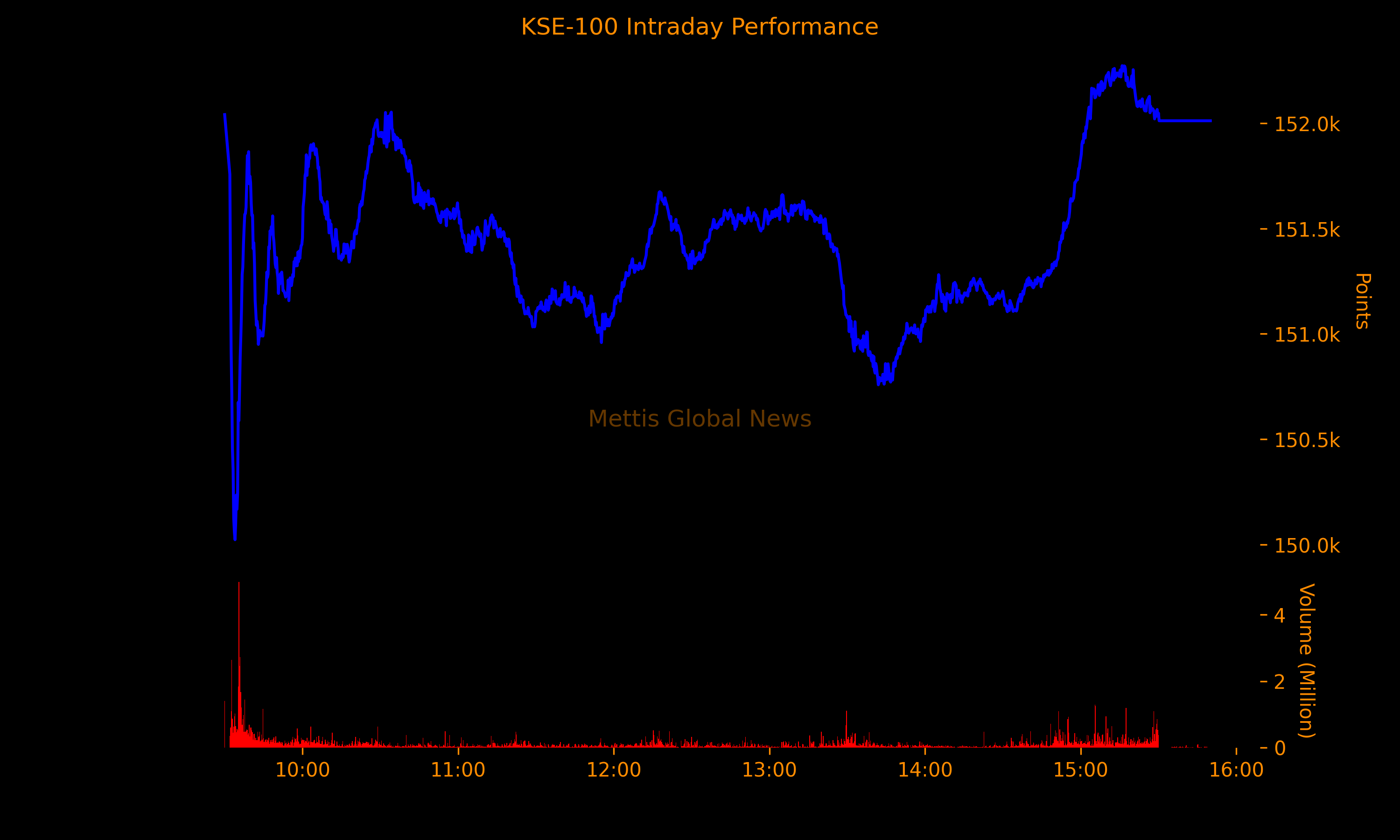 The KSE-100 Index concluded the session at 152,011.26, having traded in a range of 2,250.20 points, with an intraday high of 152,272.63 (-3,238.93 points) and a low of 150,022.43 (-5,489.13 points).