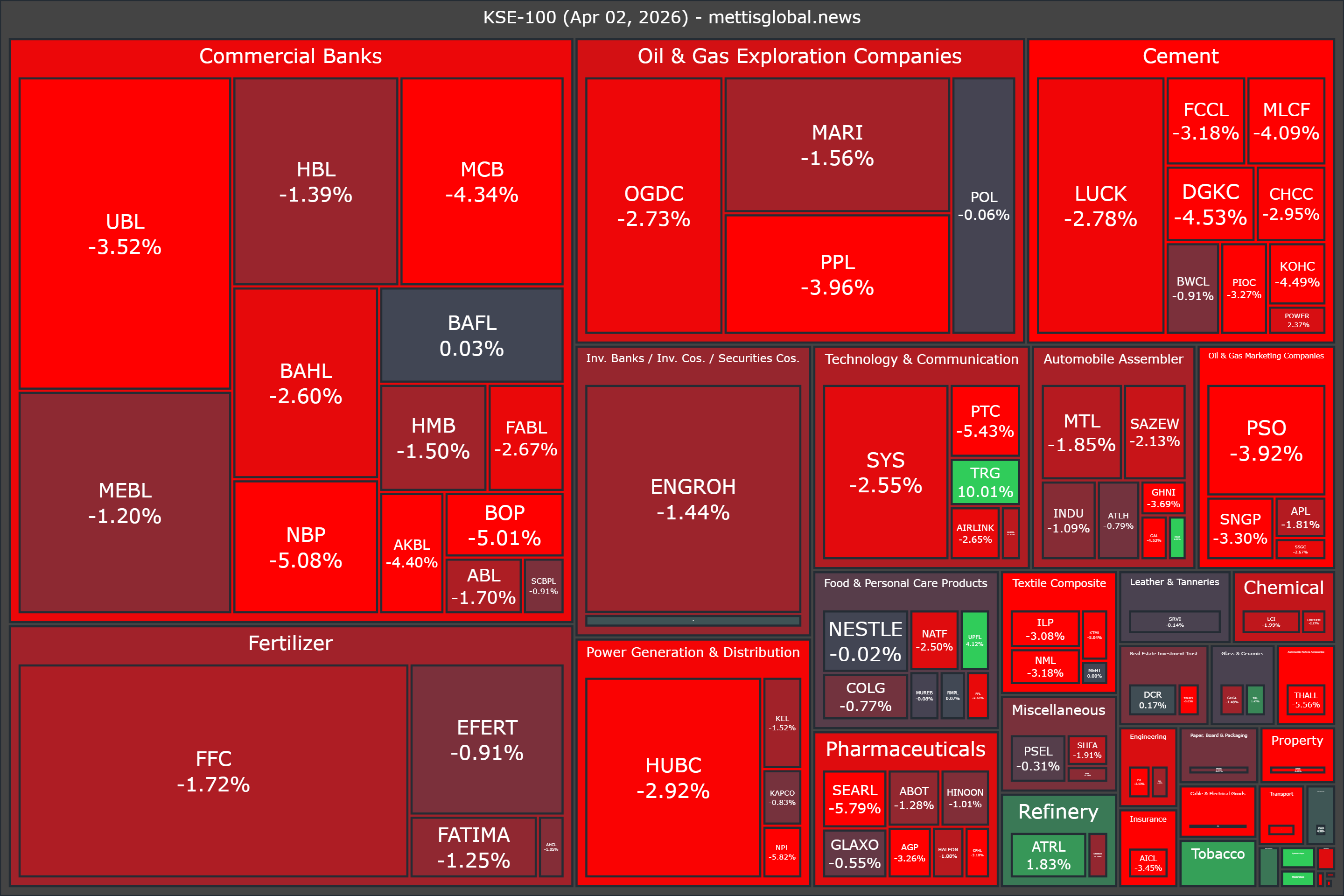 April 02, 2026 (MLN): The benchmark KSE-100 Index concluded Thursday's trading session lower, with the benchmark KSE-100 Index shedding 3,500.30 points or 2.25%, reflecting broad-based selling amid weak global cues and rising geopolitical tensions.