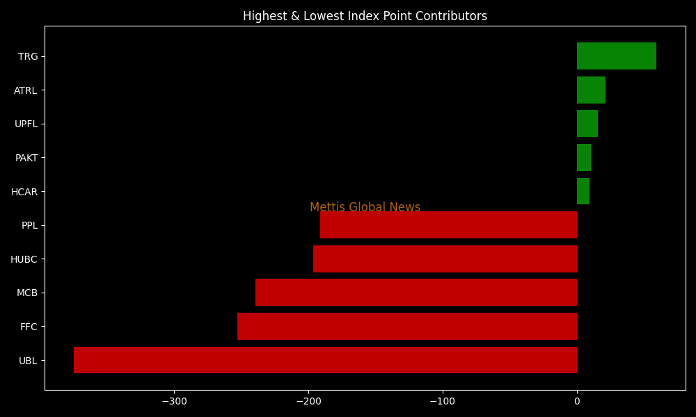 In terms of index-point contribution, the slide was led by UBL (-374.72 points), FFC (-252.66 points), MCB (-239.47 points), HUBC (-196.59 points), and PPL (-190.94 points). Marginal support came from TRG (+59.45 points), ATRL (+21.46 points), UPFL (+16.04 points), PAKT (+10.45 points), and HCAR (+9.67 points).