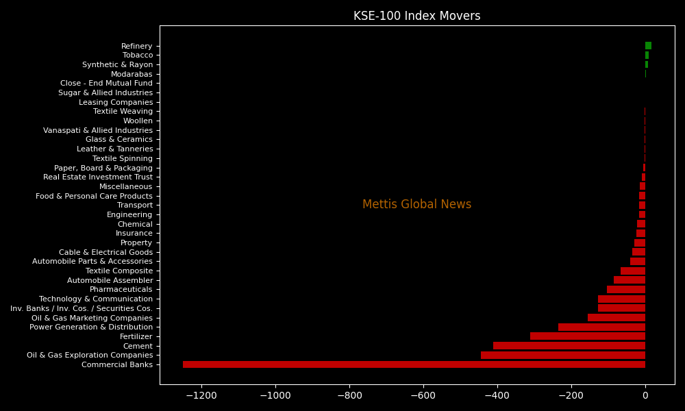 Sector-wise, the KSE-100 Index was dragged lower by Commercial Banks (-1,250.40 points), Oil & Gas Exploration Companies (-444.30 points), Cement (-410.50 points), Fertilizer (-310.41 points), and Power Generation & Distribution (-234.27 points). On the upside, limited support came from Refinery (+17.21 points), Tobacco (+10.45 points), Synthetic & Rayon (+7.67 points), Modarabas (+2.98 points), and Close-End Mutual Funds (+1.37 points).