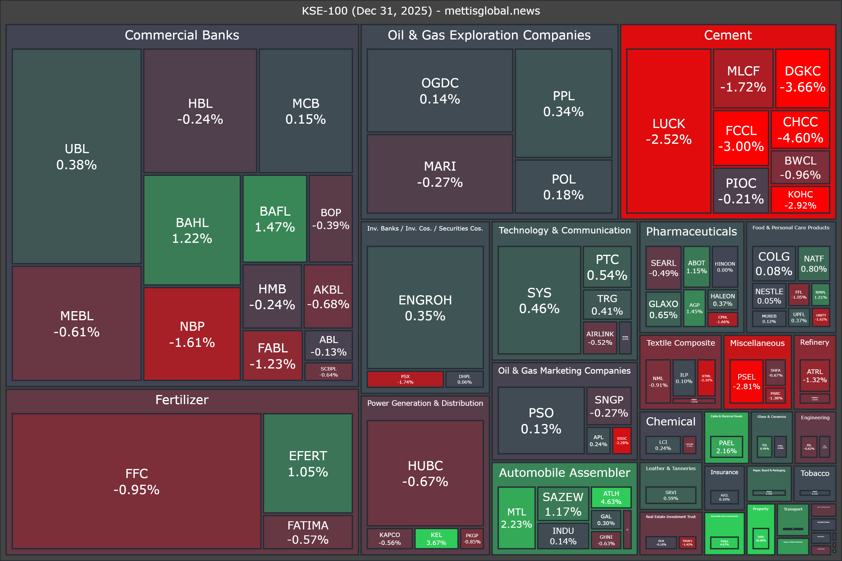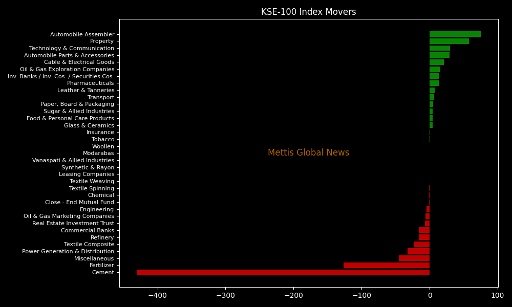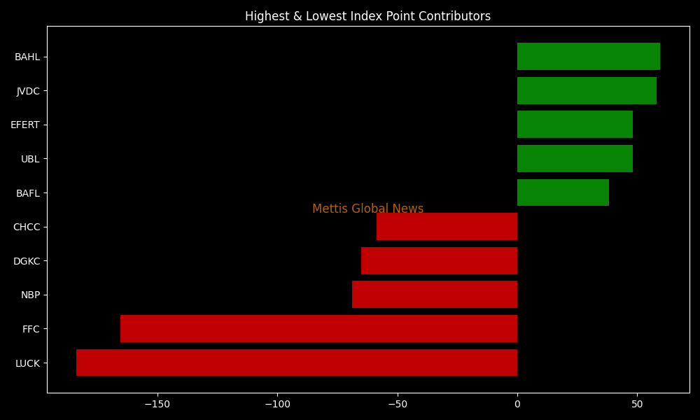 In terms of index-point contributions, companies that dragged the index lower were LUCK (-183.83pts), FFC (-165.49pts), NBP (-68.76pts), DGKC (-65.14pts), and CHCC (-58.53pts).