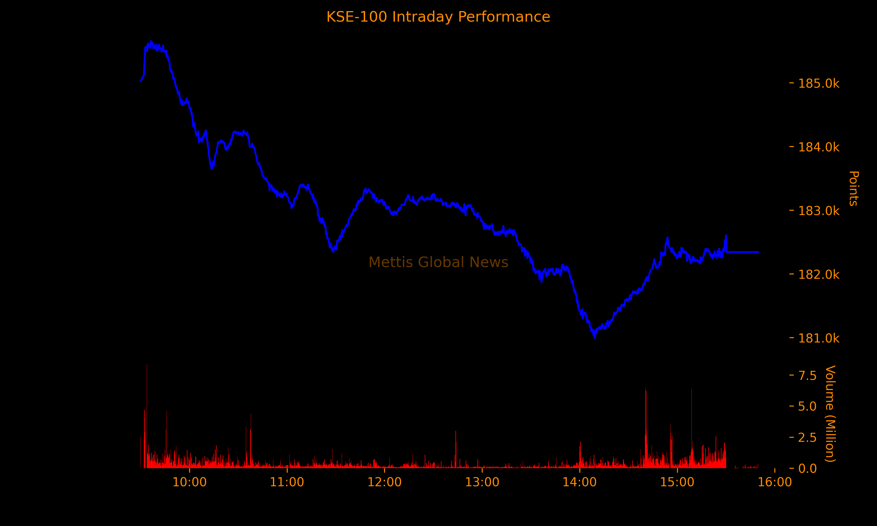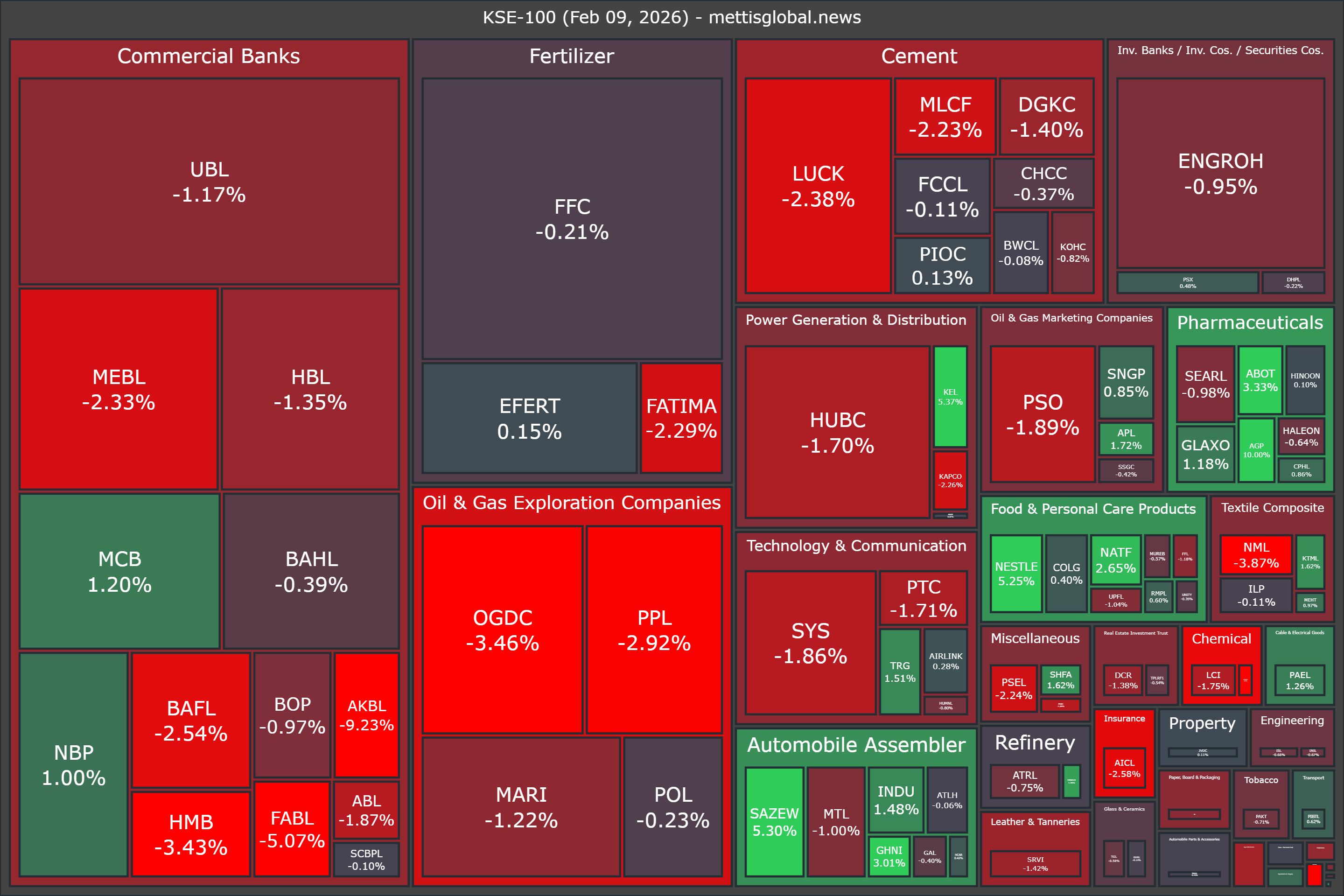 February 09, 2026 (MLN): The benchmark KSE-100 Index concluded Monday's trading session at 182,340.38, showing a decrease of 1,789.20 points or 0.97%.