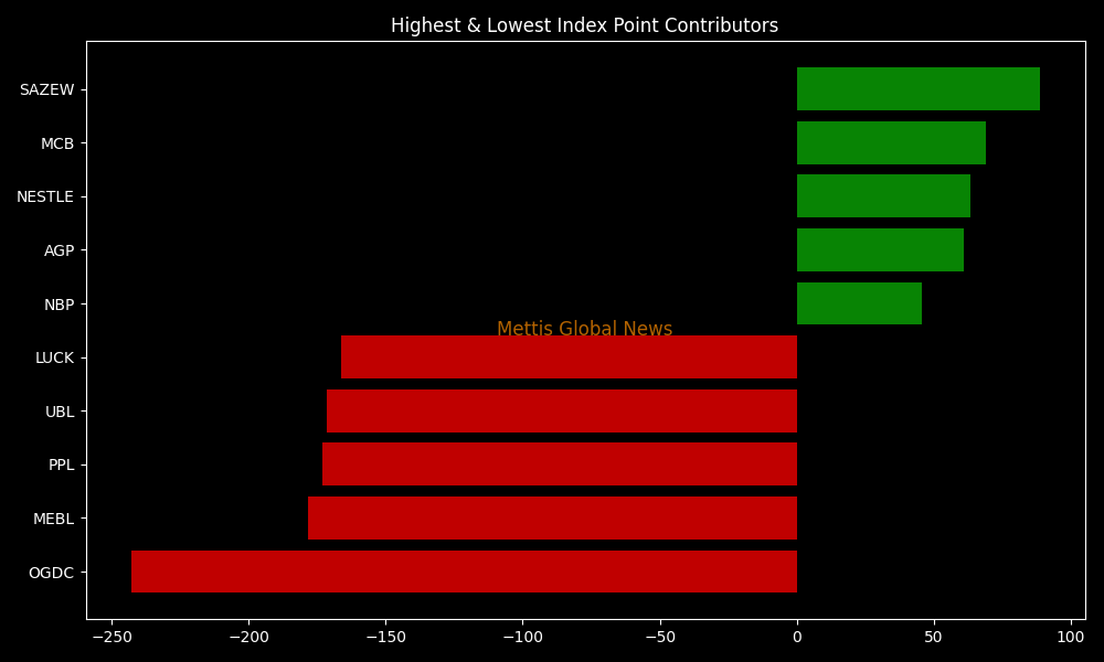 In terms of index-point contributions, companies that dragged the index lower were OGDC (-242.89pts), MEBL (-178.32pts), PPL (-173.08pts), UBL (-171.67pts), and LUCK (-166.21pts).