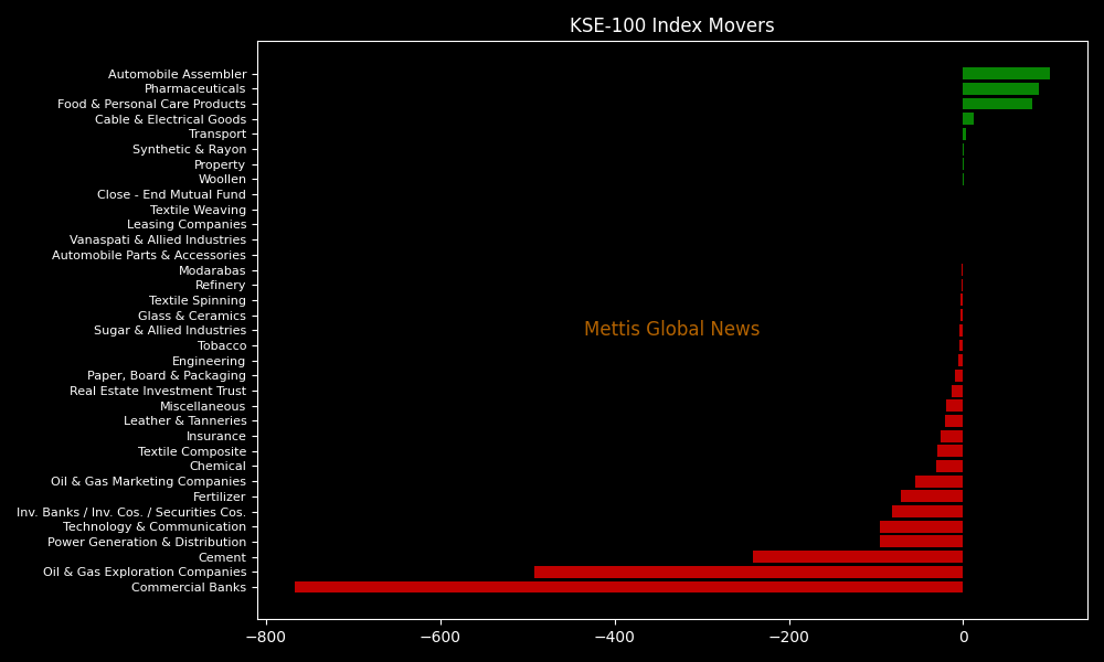 Sector-wise, KSE-100 Index was let down by Commercial Banks (-766.86pts), Oil & Gas Exploration Companies (-492.09pts), Cement (-241.45pts), Power Generation & Distribution (-95.67pts), and Technology & Communication (-95.26pts).