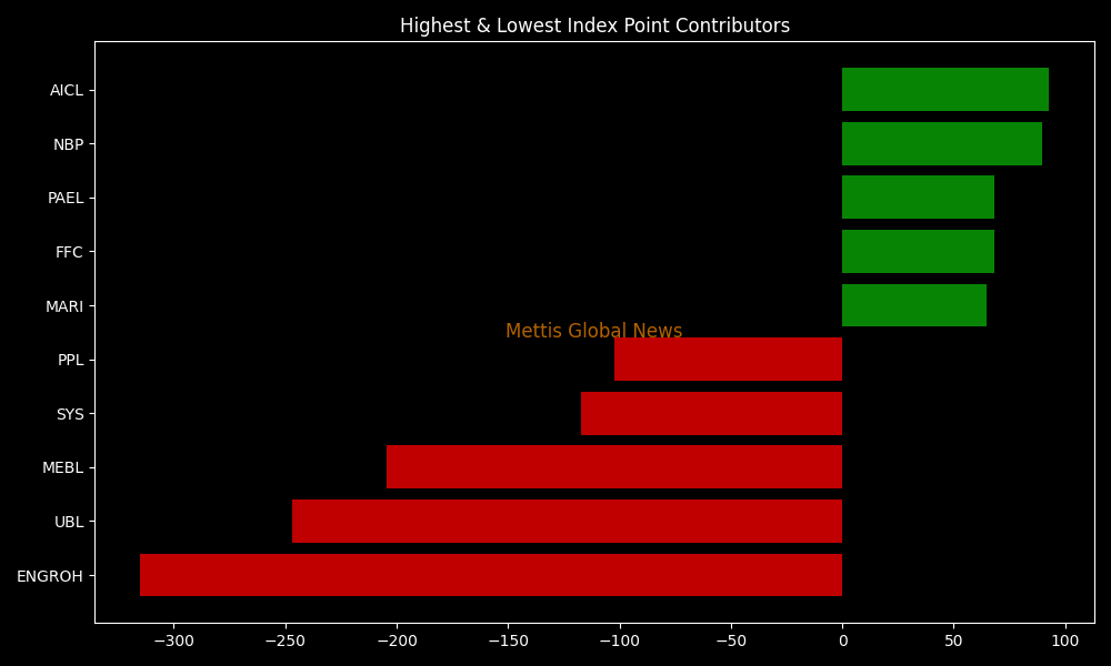 Meanwhile, companies that added points to the index were AICL (+92.80pts), NBP (+89.94pts), PAEL (+68.52pts), FFC (+68.06pts), and MARI (+64.70pts).