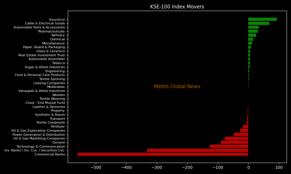 Sector-wise, KSE-100 Index was let down by Commercial Banks (-559.09pts), Inv. Banks / Inv. Cos. / Securities Cos. (-332.07pts), Technology & Communication (-126.51pts), Cement (-90.55pts), and Oil & Gas Marketing Companies (-76.86pts).
