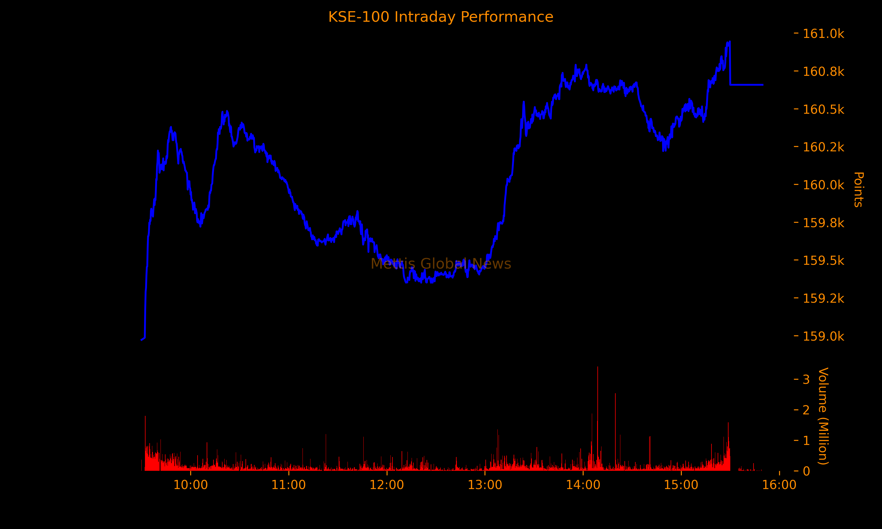 The index remained positive throughout the day showing an intraday high of 160,944.50 (+2,760.56) and a low of 158,971.48 (+787.54) points.