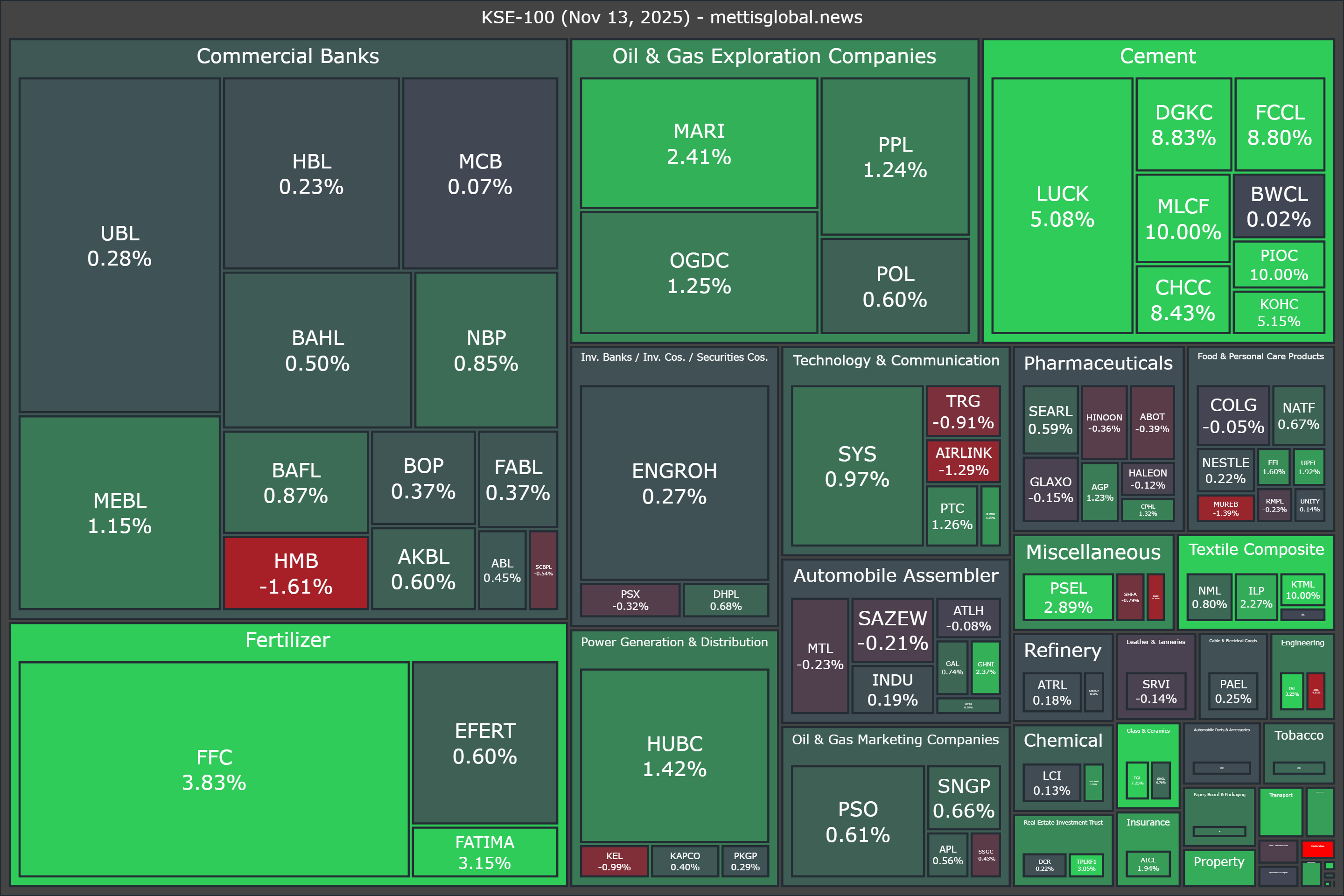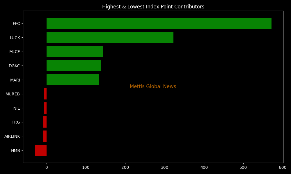 In terms of index-point contributions, companies that propped up the index were FFC (+571.34pts), LUCK (+322.67pts), MLCF (+144.63pts), DGKC (+138.07pts), and MARI (+134.10pts).