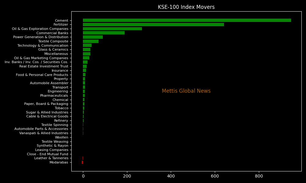 Sector-wise, KSE-100 Index was supported by Cement (+946.06pts), Fertilizer (+640.97pts), Oil & Gas Exploration Companies (+268.68pts), Commercial Banks (+189.15pts), and Power Generation & Distribution (+89.65pts).