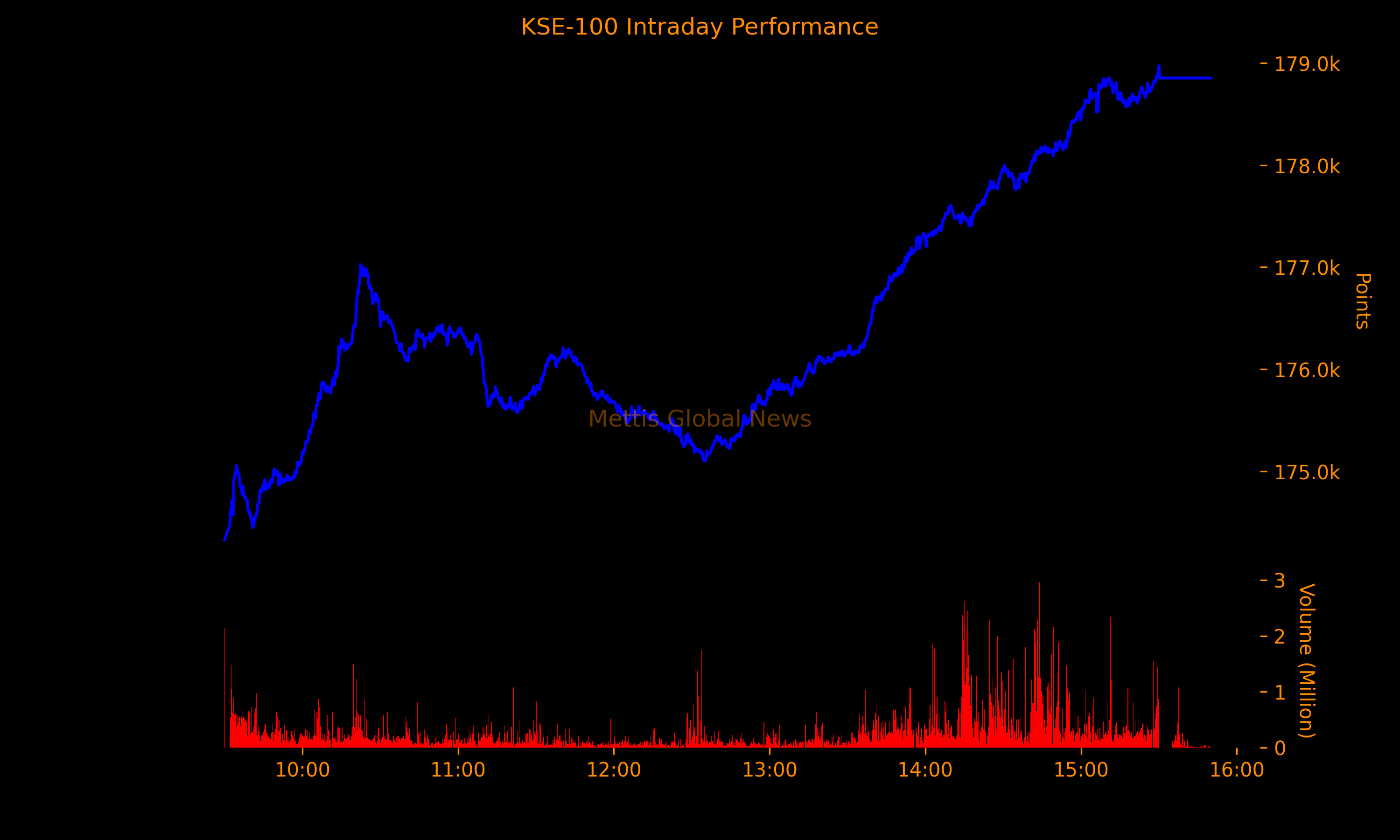 The index remained positive throughout the day showing an intraday high of 178,974.16 (+5,823.75) and a low of 174,328.61 (+1,178.20) points.