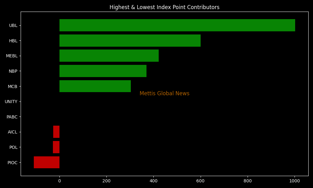 In terms of index-point contributions, companies that propped up the index were UBL (+1002.67pts), HBL (+600.21pts), MEBL (+422.33pts), NBP (+370.19pts), and MCB (+303.81pts).