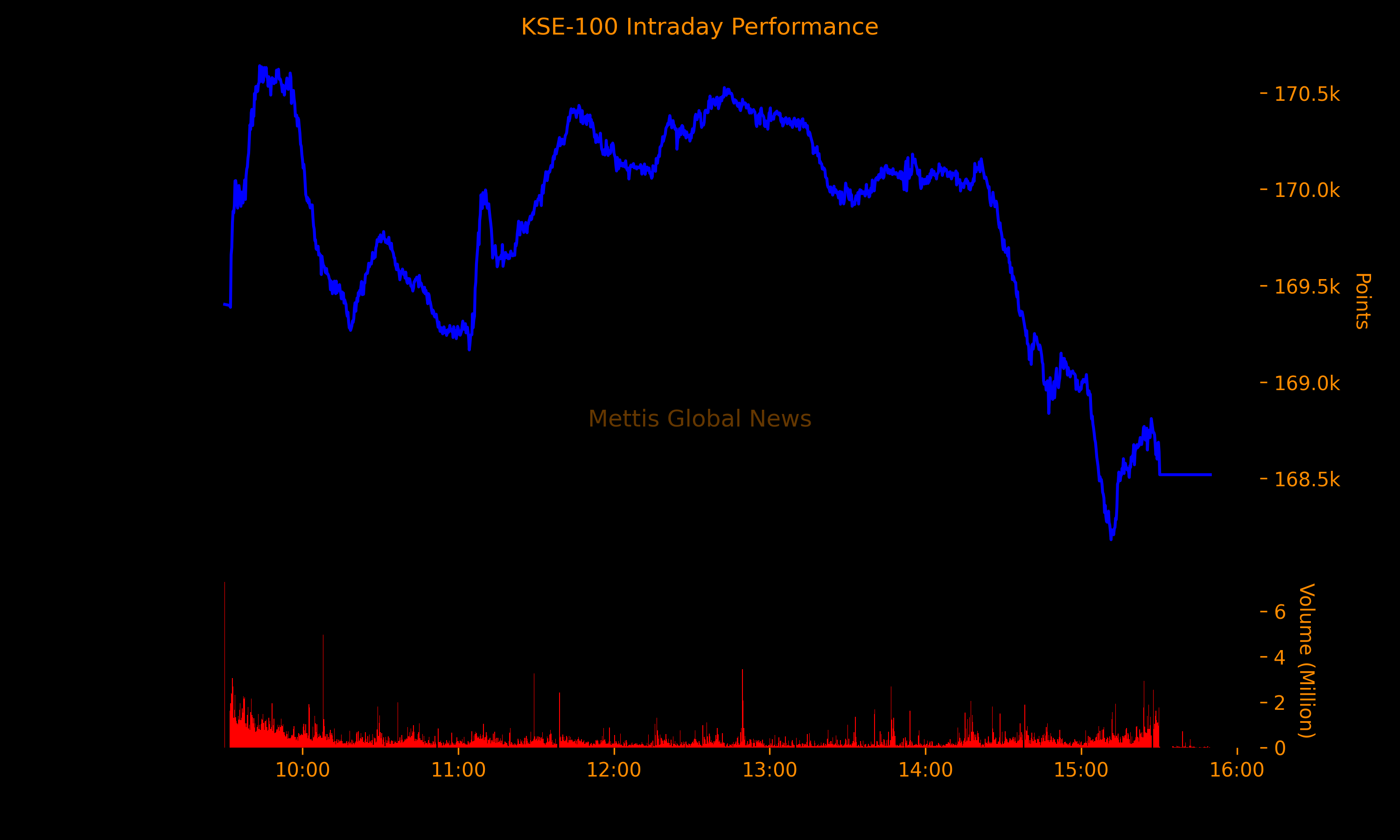 The KSE-100 Index closed at 168,519.94, rising 2,885.10 points or 1.74%. The index remained firmly in positive territory throughout the session, hitting an intraday high of 170,640.26 (+5,005.42 points) and a low of 168,182.98 (+2,548.14 points), reflecting sustained buying interest.