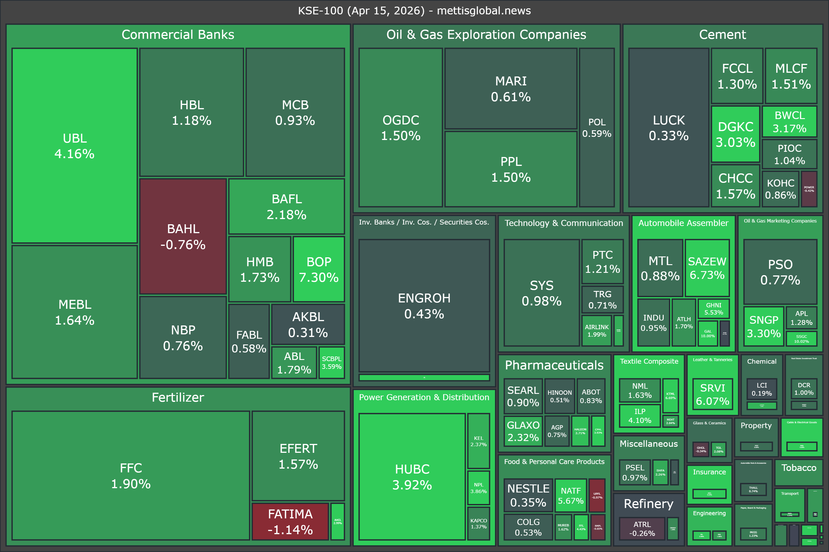 April 15, 2026 (MLN): Stocks at the Pakistan Stock Exchange continued their upward momentum on Wednesday, with the benchmark KSE-100 Index posting strong gains, supported by improved macroeconomic sentiment and easing global oil prices amid renewed diplomatic optimism.