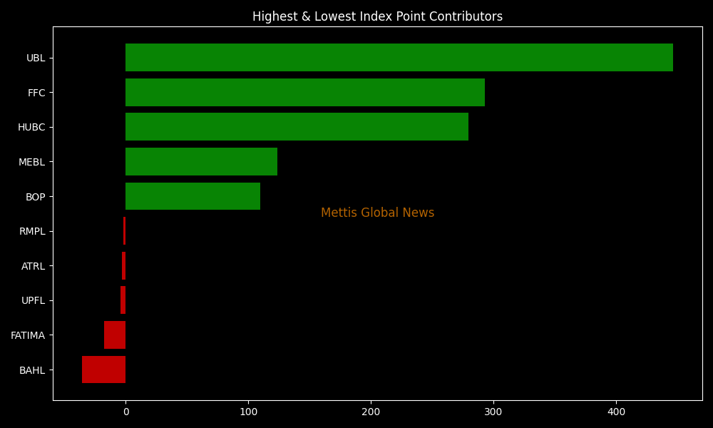 In terms of index-point contribution, the gains were driven by UBL (+446.00 points), FFC (+292.99 points), HUBC (+279.30 points), MEBL (+123.35 points), and BOP (+109.76 points). Meanwhile, slight pressure came from BAHL (-35.58 points), FATIMA (-17.87 points), and UPFL (-4.14 points).