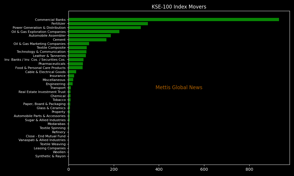 Sector-wise, the KSE-100 Index was supported by Commercial Banks (+931.98 points), Fertilizer (+351.81 points), Power Generation & Distribution (+319.77 points), Oil & Gas Exploration Companies (+225.00 points), and Automobile Assembler (+186.96 points), indicating broad-based strength across key sectors.