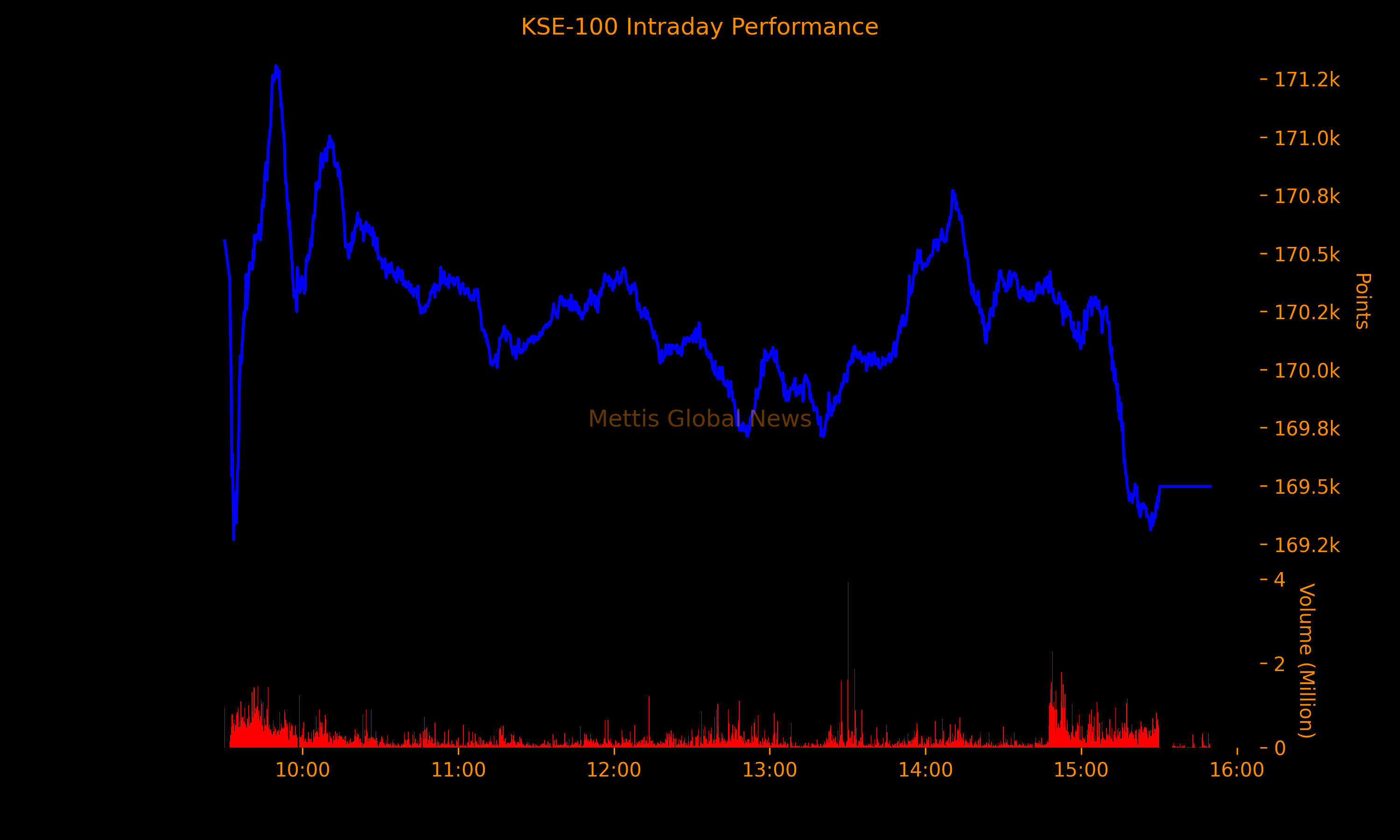 The KSE-100 Index settled at 169,497.35, down 1,174.69 points or 0.69%. The index traded in a relatively narrow range of 2,038.28 points, hitting an intraday high of 171,306.61 (+634.57 points) and a low of 169,268.33 (-1,403.71 points).