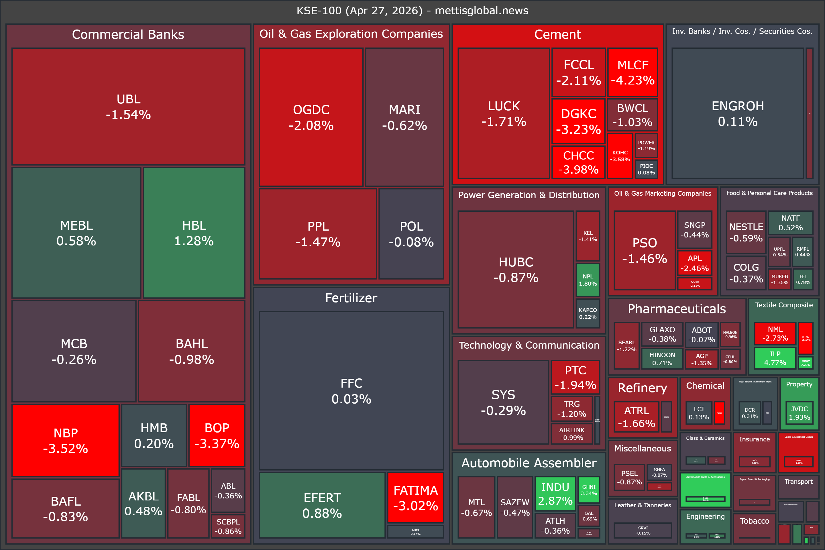 April 27, 2026 (MLN): Stocks at the Pakistan Stock Exchange closed lower on Monday, with the benchmark KSE-100 Index ending in the red as renewed setbacks in US-Iran diplomatic efforts and rising global oil prices weighed on investor sentiment.