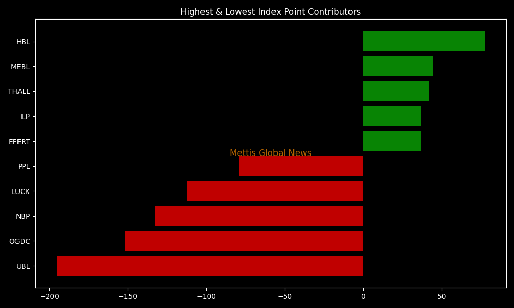 In terms of index-point contribution, the downside was driven by UBL (-195.39 points), OGDC (-151.87 points), NBP (-132.61 points), LUCK (-112.30 points), and PPL (-79.15 points). Meanwhile, support came from HBL (+77.50 points), MEBL (+44.48 points), THALL (+41.62 points), ILP (+37.13 points), and EFERT (+36.66 points).