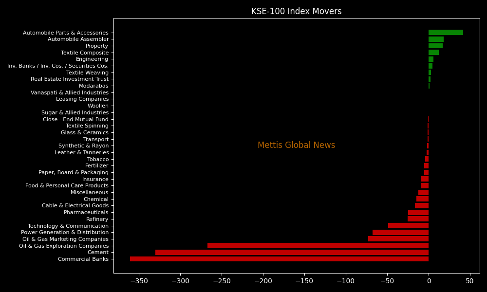 Sector-wise, the KSE-100 Index was weighed down by Commercial Banks (-360.48 points), Cement (-329.76 points), Oil & Gas Exploration Companies (-267.24 points), Oil & Gas Marketing Companies (-72.99 points), and Power Generation & Distribution (-67.54 points). Some support was observed in automobile-related and textile sectors.