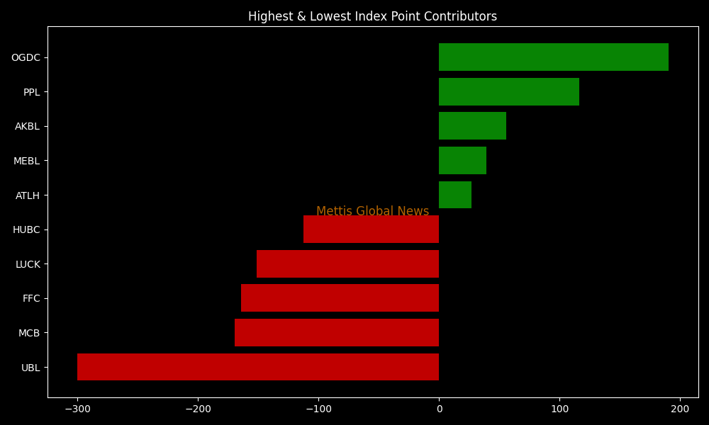 In terms of index-point contributions, companies that dragged the index lower were UBL (-300.35pts), MCB (-169.54pts), FFC (-164.04pts), LUCK (-151.06pts), and HUBC (-112.27pts).