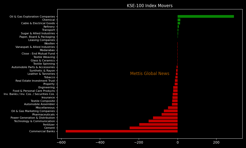 Sector-wise, KSE-100 Index was let down by Commercial Banks (-576.59pts), Cement (-246.90pts), Fertilizer (-197.30pts), Technology & Communication (-148.75pts), and Power Generation & Distribution (-126.41pts).