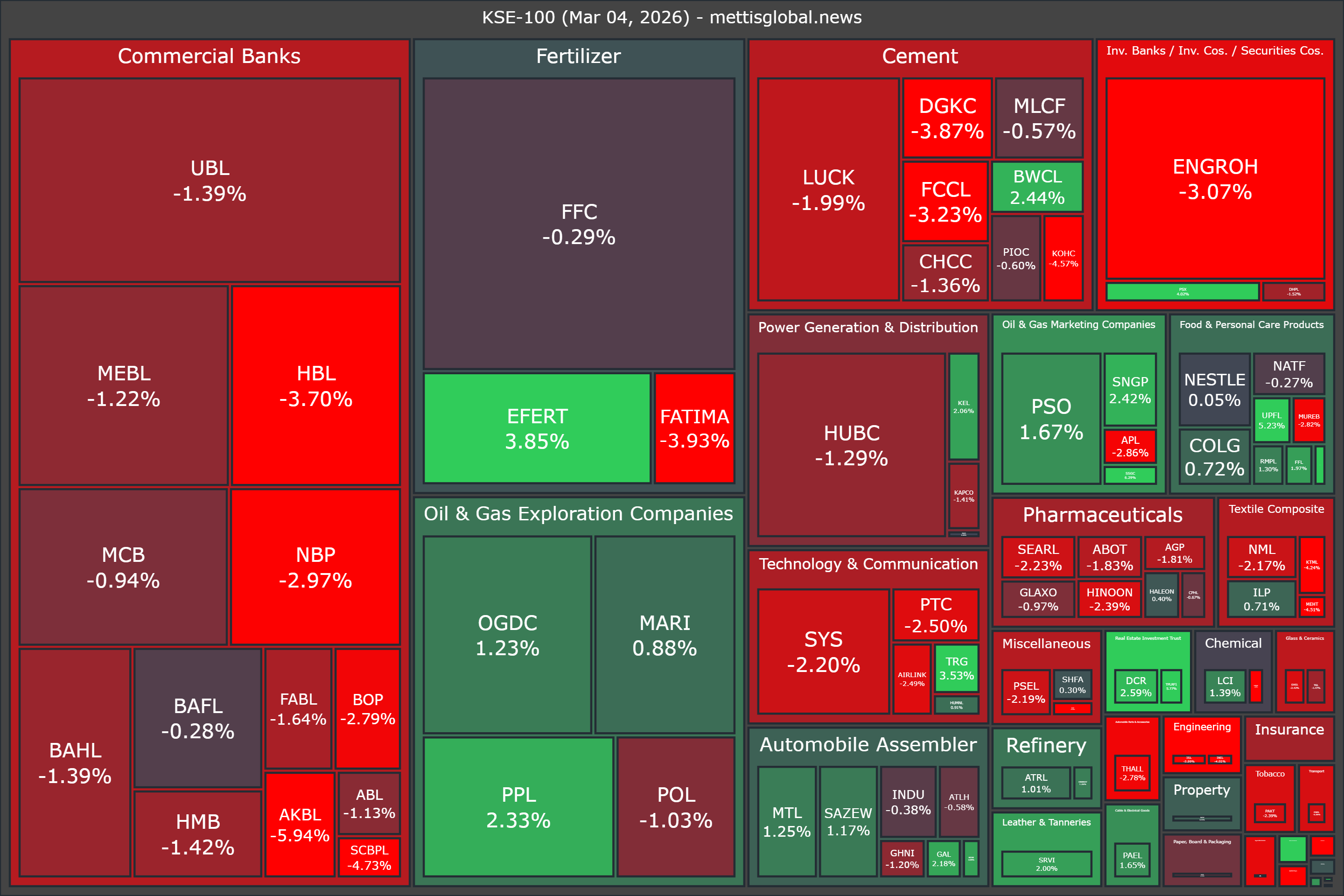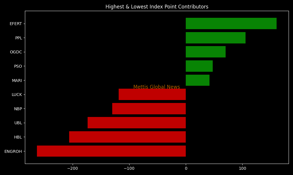 In terms of index-point contribution, major drags came from ENGROH (-262.78pts), HBL (-206.23pts), UBL (-173.36pts), NBP (-129.91pts), and LUCK (-118.54pts), whereas support was provided by EFERT (+160.44pts), PPL (+105.60pts), OGDC (+70.26pts), PSO (+47.78pts), and MARI (+41.87pts).