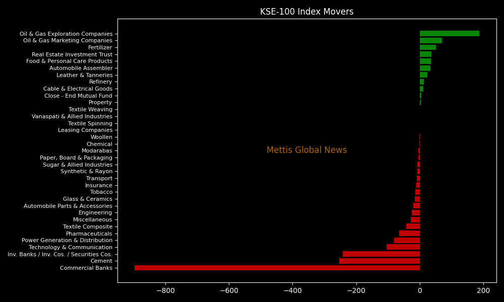 The market found support in Oil & Gas Exploration Companies (+187.53pts), Oil & Gas Marketing Companies (+70.72pts), Fertilizer (+51.89pts), Real Estate Investment Trusts (+37.37pts), and Food & Personal Care Products (+34.92pts).