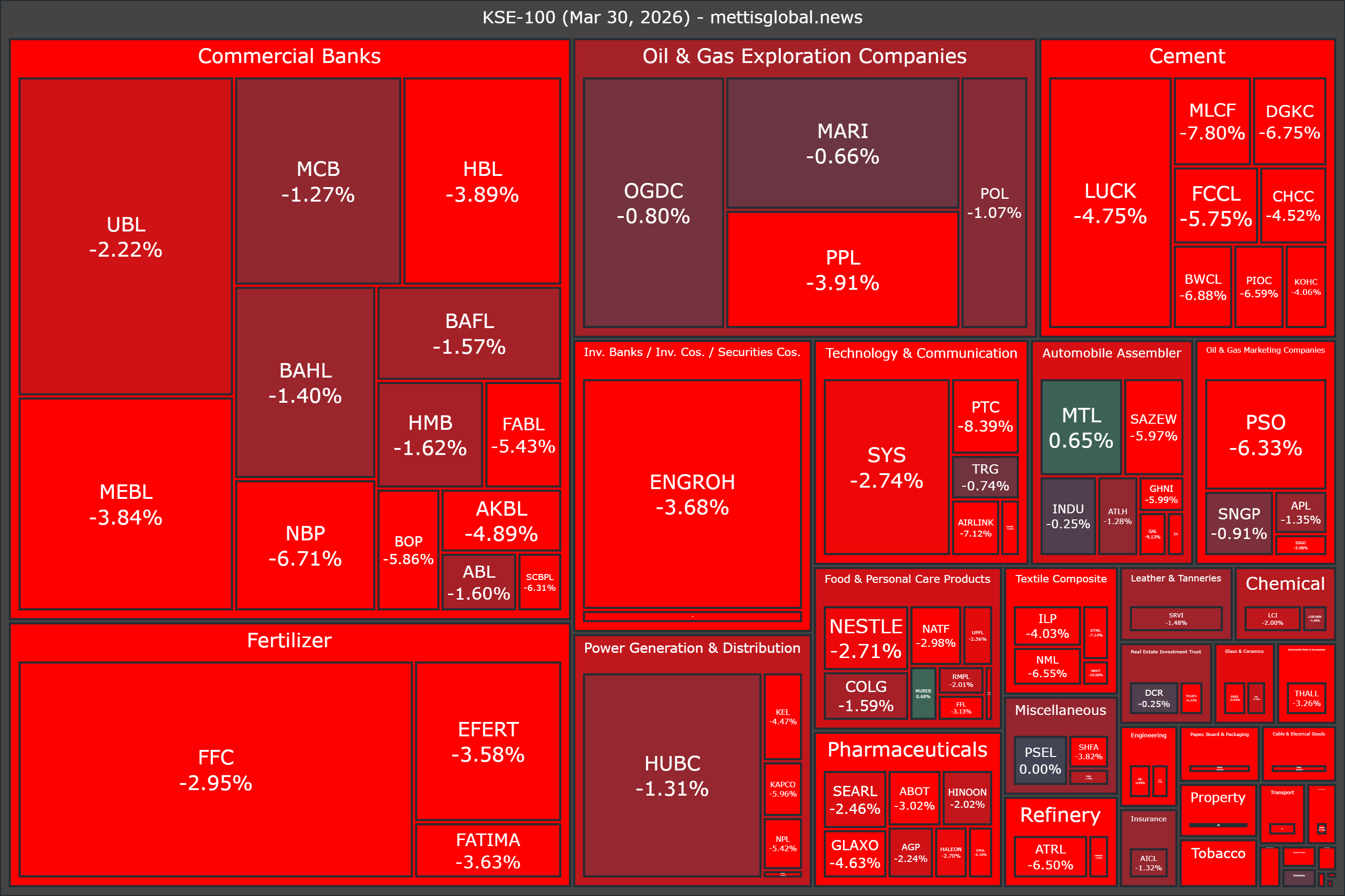 March 30, 2026 (MLN): The Pakistan Stock Exchange (PSX) ended Monday’s session deep in the red, as the benchmark KSE-100 Index extended losses amid heightened geopolitical uncertainty, rising oil prices, and concerns over potential disruptions to domestic economic activity.