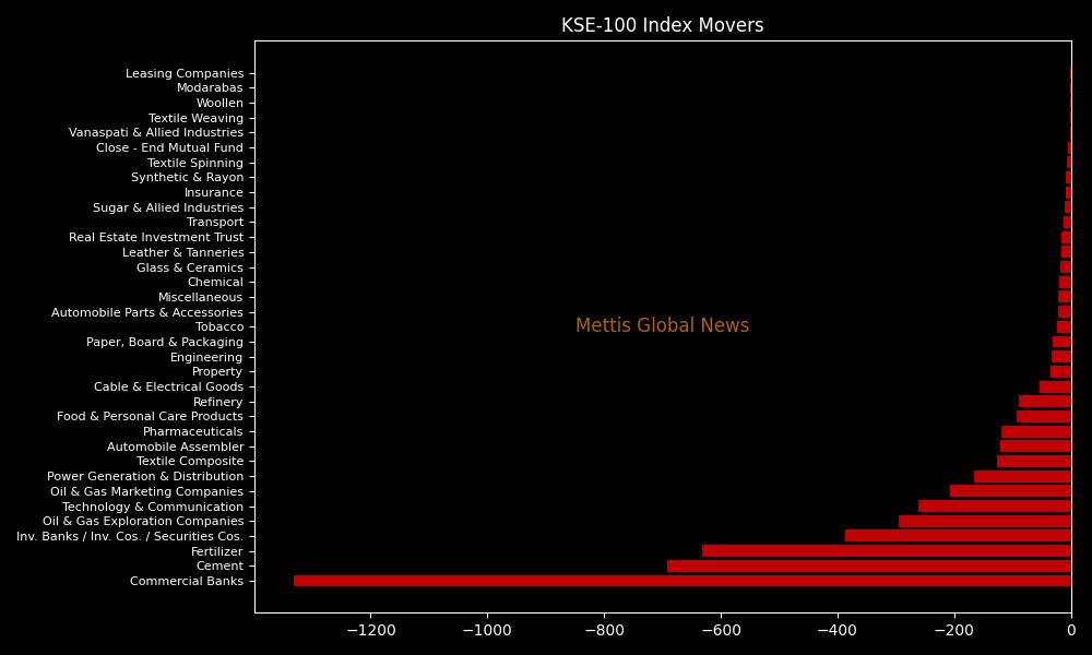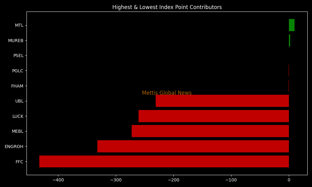 In terms of index-point contributions, the decline was primarily driven by FFC (-432.53pts), ENGROH (-331.98pts), MEBL (-272.38pts), LUCK (-260.65pts), and UBL (-230.75pts). Meanwhile, MTL (+9.87pts) and MUREB (+2.14pts) offered limited support.