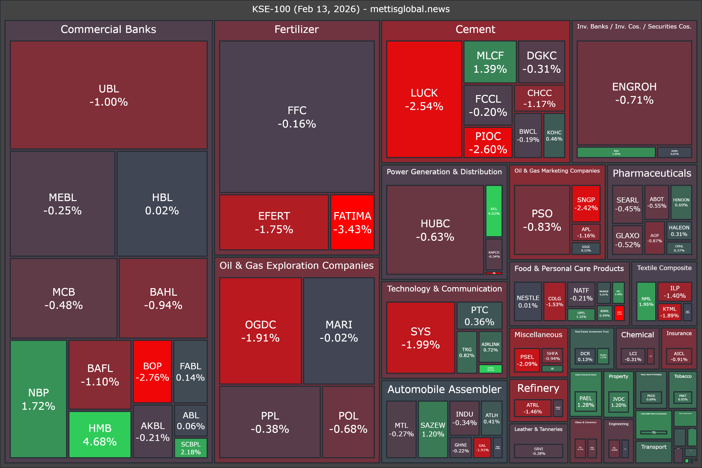 February 13, 2026 (MLN): The benchmark KSE-100 Index concluded Friday's trading session at 179,603.73, showing a decrease of 908.91 points or 0.50%.