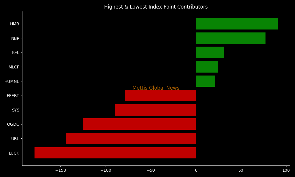 In terms of index-point contributions, companies that dragged the index lower were LUCK (-179.04pts), UBL (-144.37pts), OGDC (-125.28pts), SYS (-89.55pts), and EFERT (-78.81pts).