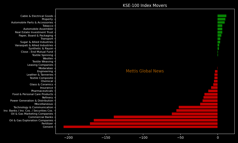 Sector-wise, KSE-100 Index was let down by Cement (-206.64pts), Fertilizer (-171.39pts), Oil & Gas Exploration Companies (-166.04pts), Commercial Banks (-139.29pts), and Oil & Gas Marketing Companies (-61.28pts).