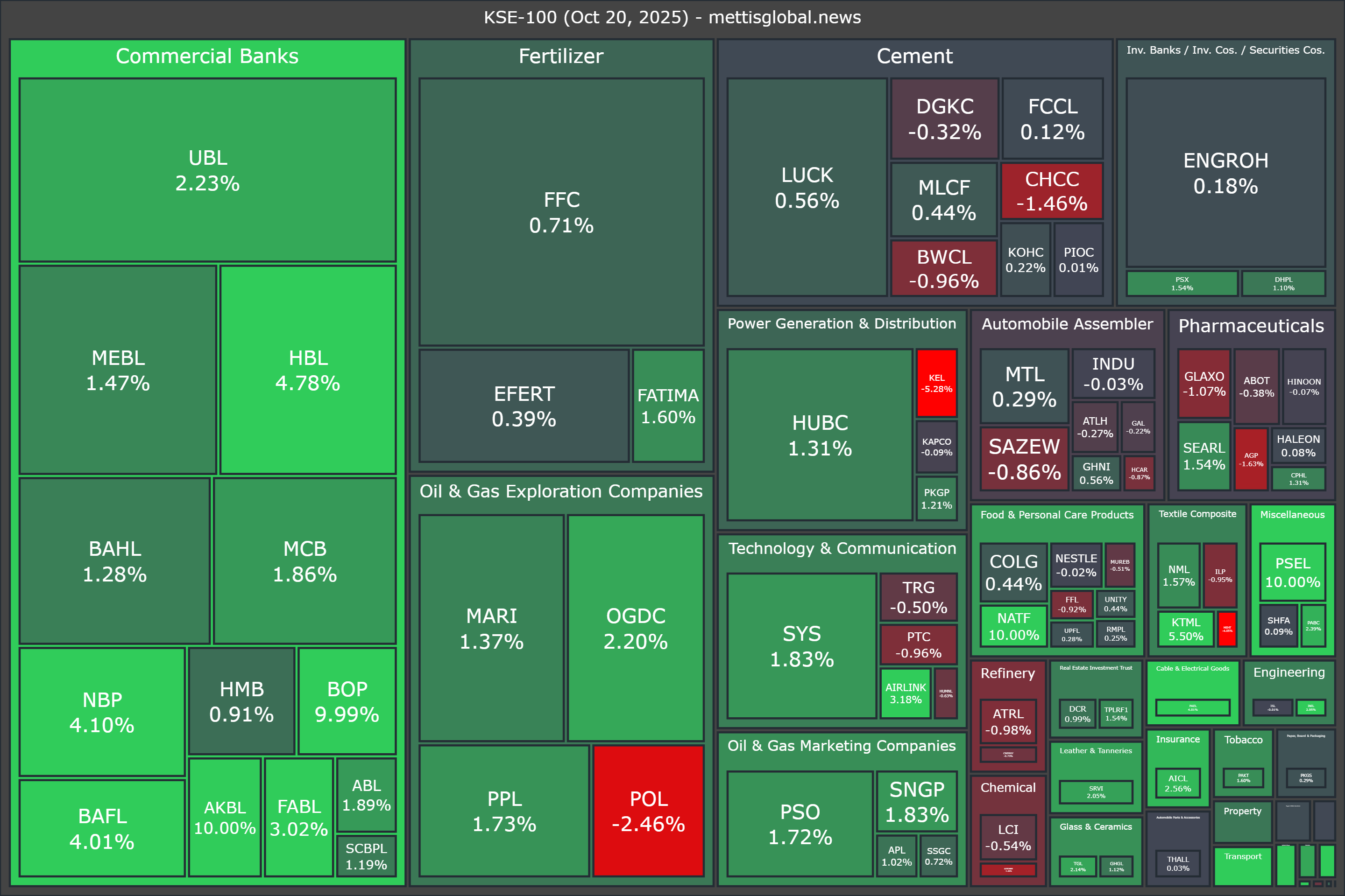 October 20, 2025 (MLN): The benchmark KSE-100 Index concluded Monday's trading session at 166,242.90, showing an increase of 2,436.69 points or 1.49%.