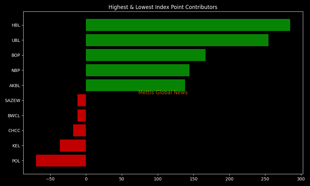 In terms of index-point contributions, companies that propped up the index were HBL (+284.66pts), UBL (+254.55pts), BOP (+166.67pts), NBP (+144.44pts), and AKBL (+138.28pts).