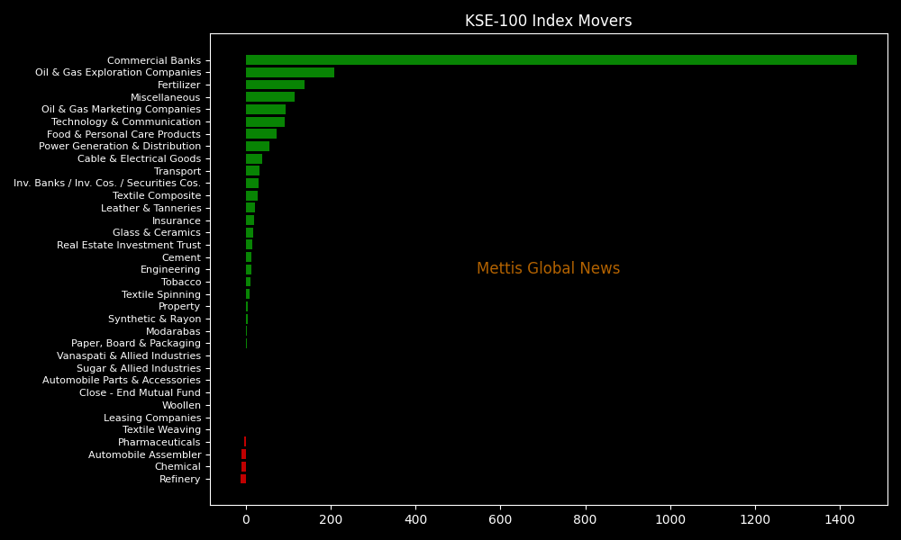 Sector-wise, KSE-100 Index was supported by Commercial Banks (+1440.06pts), Oil & Gas Exploration Companies (+207.24pts), Fertilizer (+138.93pts), Miscellaneous (+114.85pts), and Oil & Gas Marketing Companies (+93.31pts).