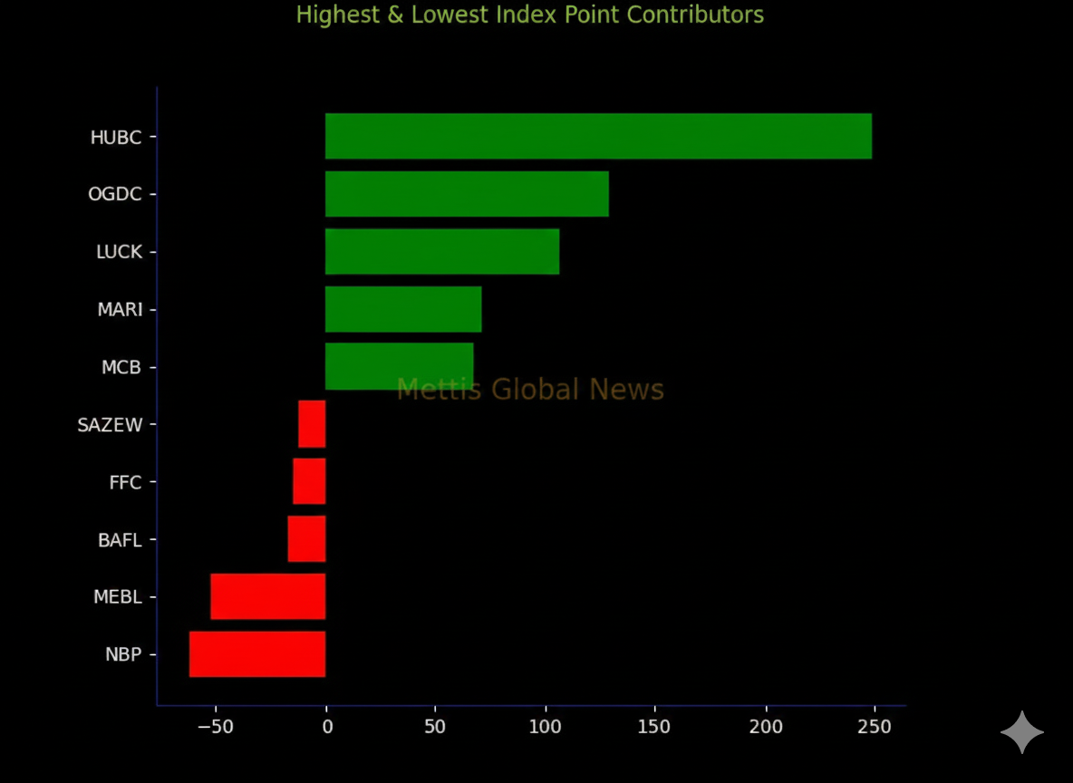 Companies adding points to the index were HUBC with 248.34, OGDC with 128.76, LUCK with 106.43, MARI with 70.83 and MCB with 67.39 points.
