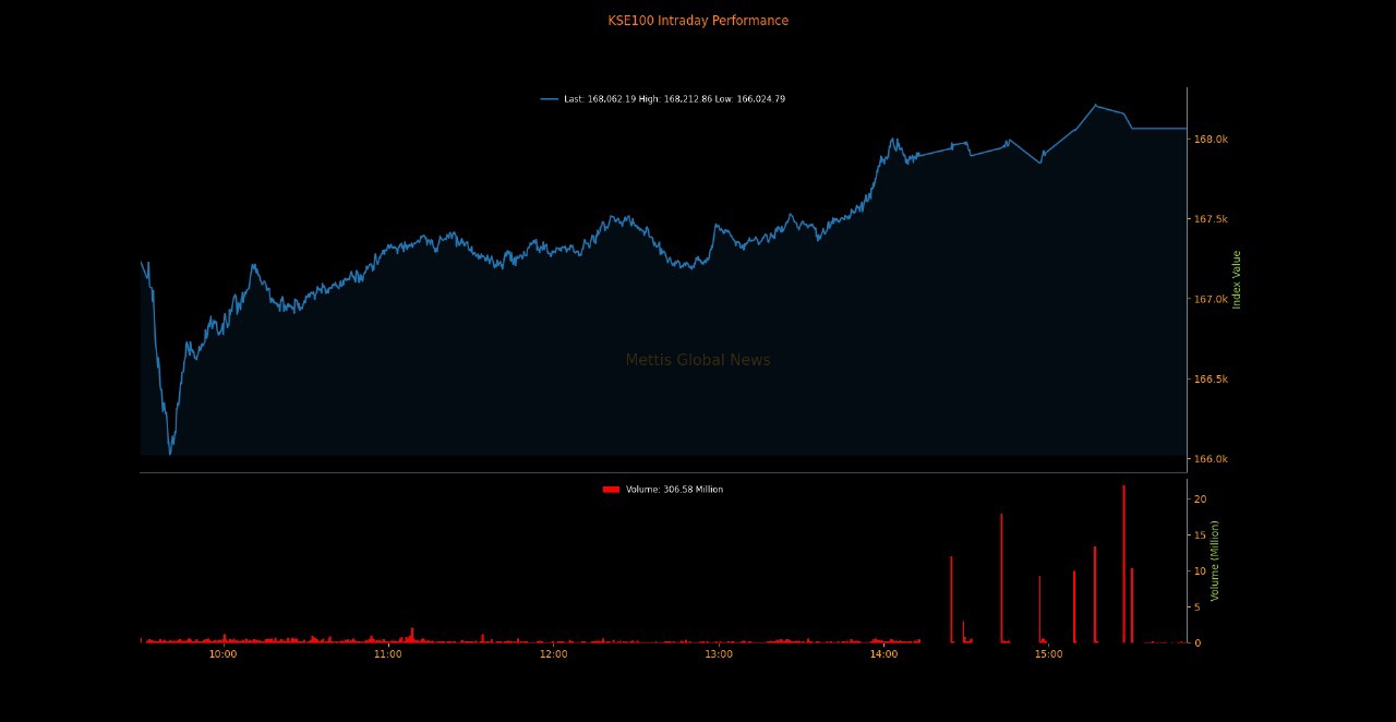 The index traded in a range of 2221.43 points showing an intraday high of 168,246.22 (+1568.52) and a low of 166,024.79 (-652.91) points.