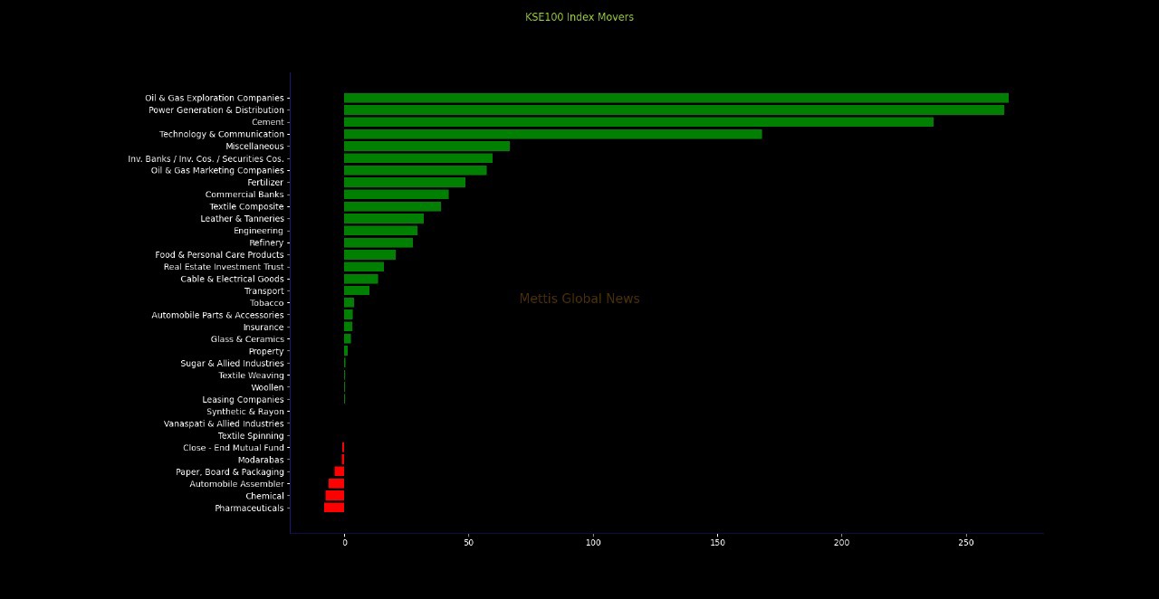 KSE100 index was supported by Oil & Gas Exploration Companies with 267.21, Power Generation & Distribution with 265.29, Cement with 236.7, Technology & Communication with 167.86 and Miscellaneous with 66.34 points.