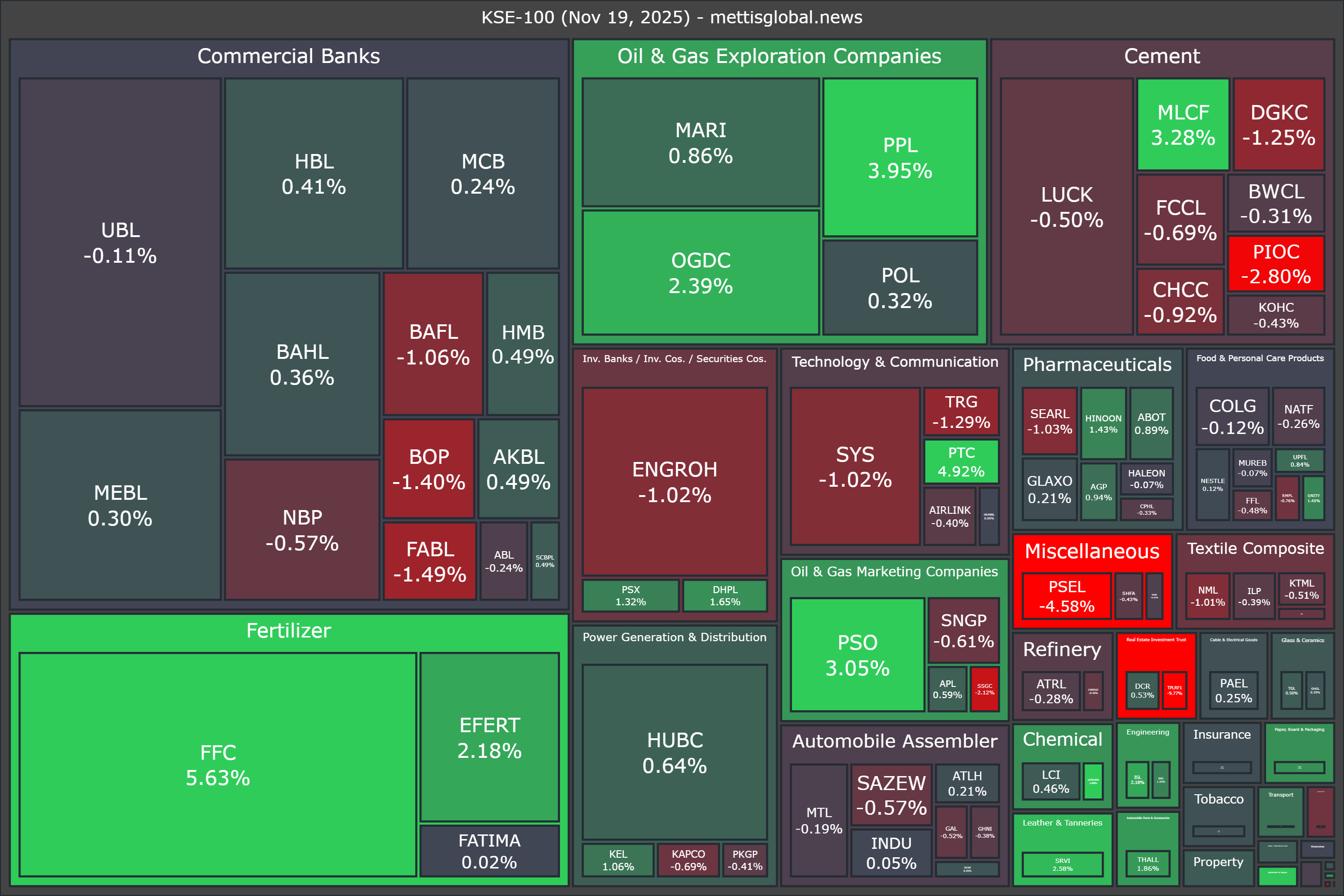 November 19, 2025 (MLN): The benchmark KSE-100 Index concluded Wednesday's trading session at 162,226.27, showing an increase of 1,291.14 points or 0.80%.