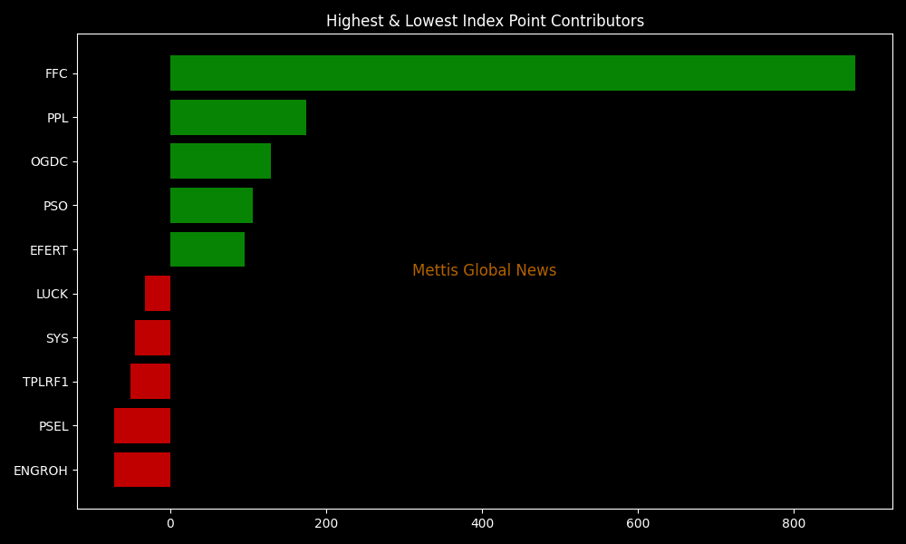 In terms of index-point contributions, companies that propped up the index were FFC (+878.86pts), PPL (+173.93pts), OGDC (+128.98pts), PSO (+106.17pts), and EFERT (+94.96pts).