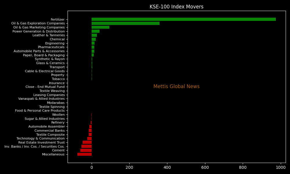 Sector-wise, KSE-100 Index was supported by Fertilizer (+974.03pts), Oil & Gas Exploration Companies (+359.84pts), Oil & Gas Marketing Companies (+94.27pts), Power Generation & Distribution (+42.39pts), and Leather & Tanneries (+28.78pts).