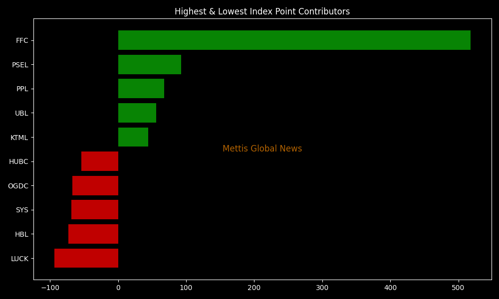 In terms of index-point contributions, companies that propped up the index were FFC (+518.13pts), PSEL (+92.35pts), PPL (+67.46pts), UBL (+56.11pts), and KTML (+43.83pts).