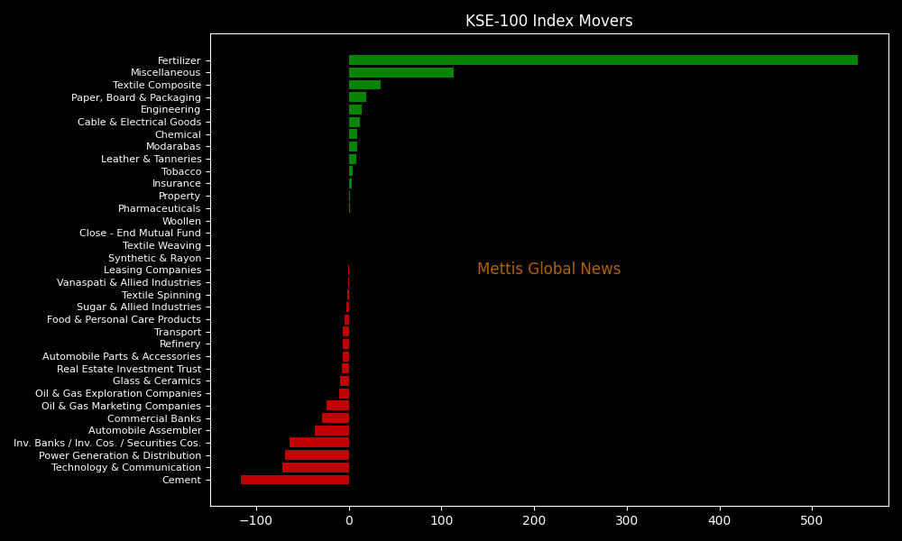 Sector-wise, KSE-100 Index was supported by Fertilizer (+548.97pts), Miscellaneous (+113.13pts), Textile Composite (+34.00pts), Paper, Board & Packaging (+18.87pts), and Engineering (+14.20pts).
