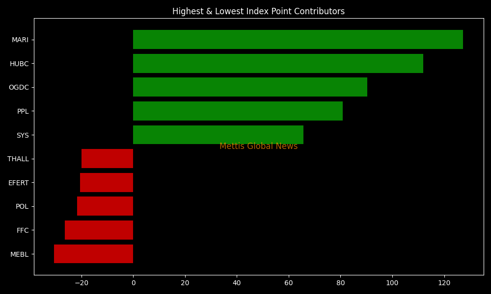In terms of index-point contributions, companies that propped up the index were MARI (+127.34pts), HUBC (+111.95pts), OGDC (+90.31pts), PPL (+80.93pts), and SYS (+65.76pts).