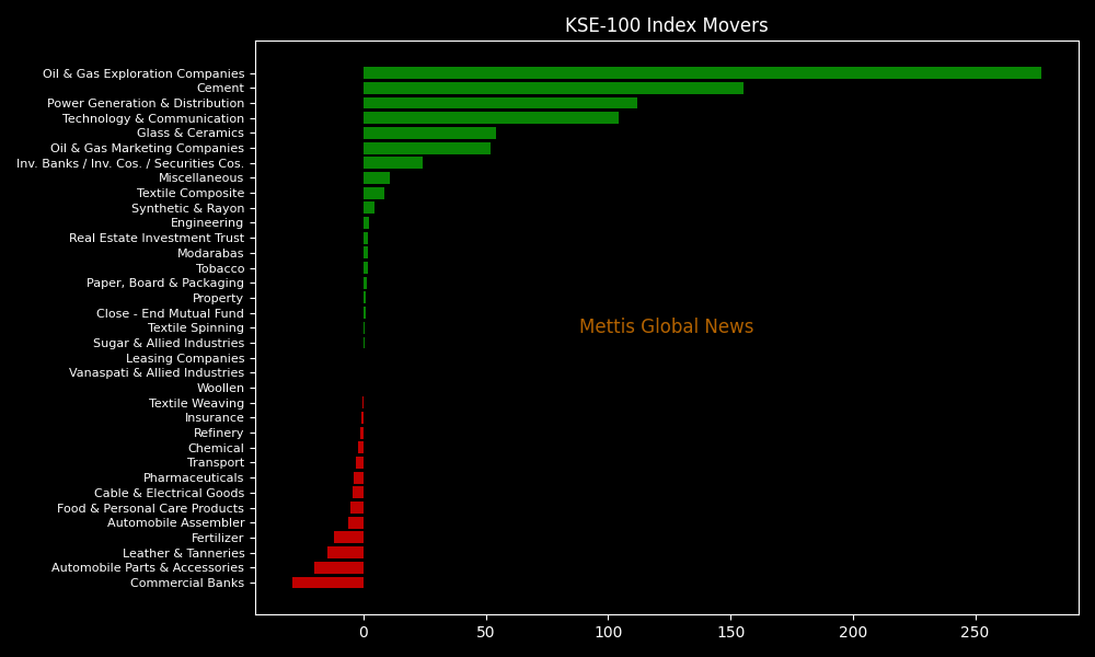Sector-wise, KSE-100 Index was supported by Oil & Gas Exploration Companies (+276.94pts), Cement (+155.42pts), Power Generation & Distribution (+111.90pts), Technology & Communication (+104.43pts), and Glass & Ceramics (+54.27pts).