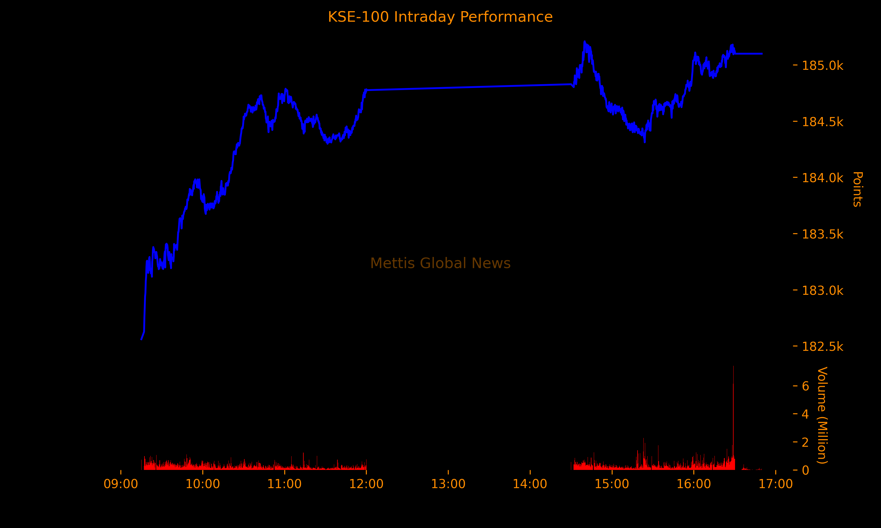 The index remained positive throughout the day showing an intraday high of 185,208.98 (+3,752.65) and a low of 182,559.69 (+1,103.36) points.