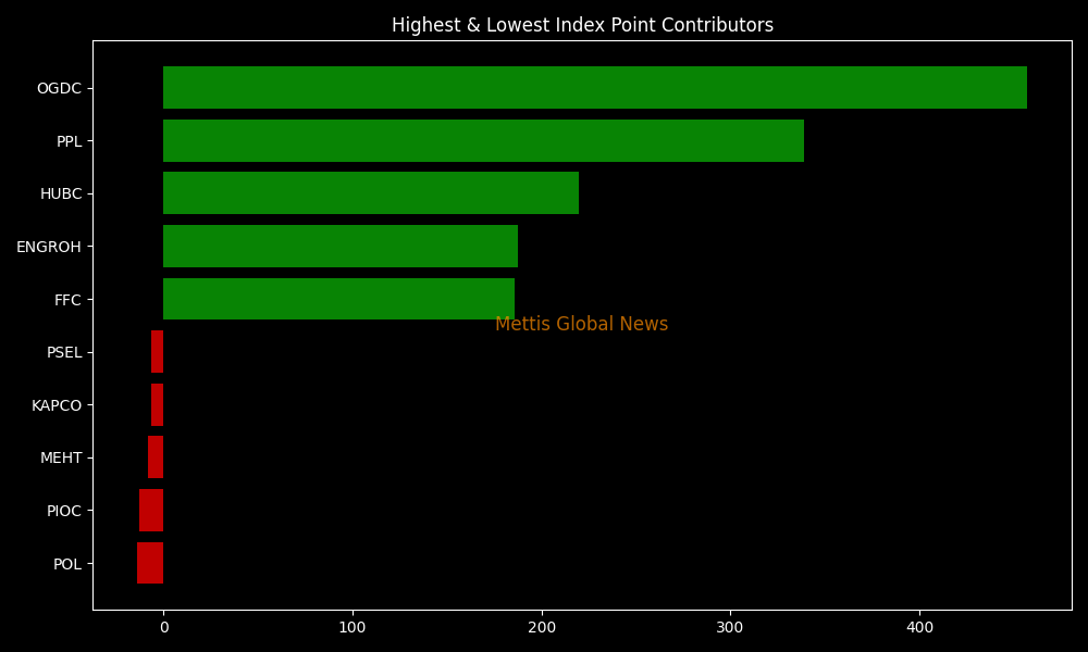 In terms of index-point contributions, companies that propped up the index were OGDC (+457.09pts), PPL (+339.24pts), HUBC (+219.60pts), ENGROH (+187.38pts), and FFC (+185.86pts).