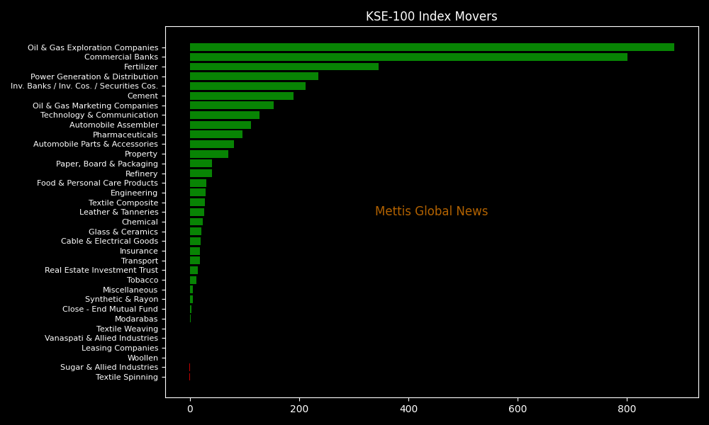 Sector-wise, KSE-100 Index was supported by Oil & Gas Exploration Companies (+886.47pts), Commercial Banks (+800.78pts), Fertilizer (+345.51pts), Power Generation & Distribution (+235.59pts), and Inv. Banks / Inv. Cos. / Securities Cos. (+211.72pts).